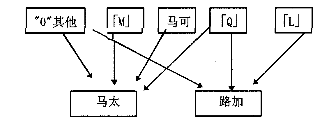 符类福音 (Synopsis即 共看 之意,故亦称 对观福音 )。这问题与 谁借用谁 的研究有极密切的关系,也是福音书次序之问题。