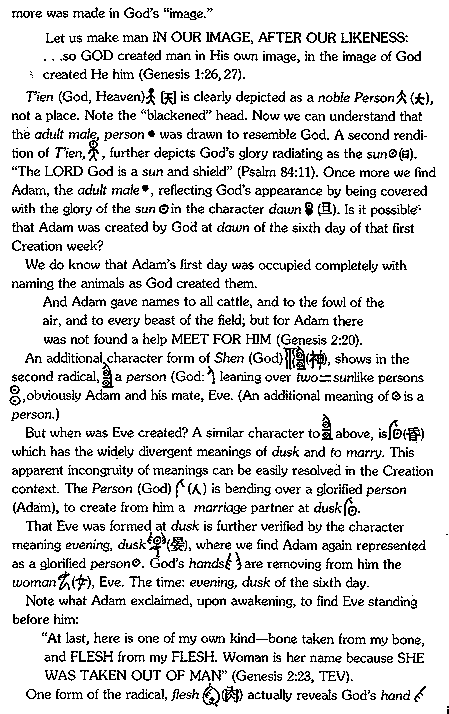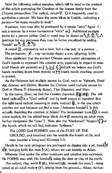 1 For more information regarding China's original religion, as well as an introduction to analysis of Chinese characters in the light of Genesis, see C.H. Kang and Ethel R. Nelson, Discovery of Genesis (St. Louis: Concordia Publishing House, 1979).