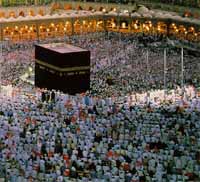 在那裡圍繞在幾十萬人的中間,從世界各國的人中 間圍,有時候被擠到差不多精疲力竭倒在那裡,炎熱的天氣中間昏倒 他也甘願,只要到最後他擠到能夠摸到中間那塊深黑色的石頭,他就 感到他這一生的宗教已經達到最高潮的條件,已經得到回教真主的喜 悅了。然後他回來的時候,許多人就死在那裡,死在阿拉伯,埋葬在 阿拉伯,但是他的家人認為那是最光榮的事情。為什麼呢?「他竟然 被真主驗中死在聖地。」